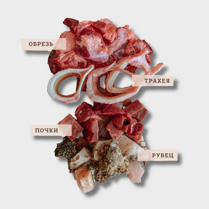 Состав:Обрезь корпусная, рубец говяжий, трахея говяжья, почки говяжьи