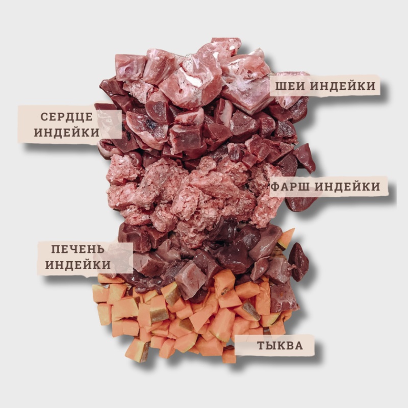 Состав:Тыква, фарш индейки, шеи индейки, сердечки индейки, печень индейки